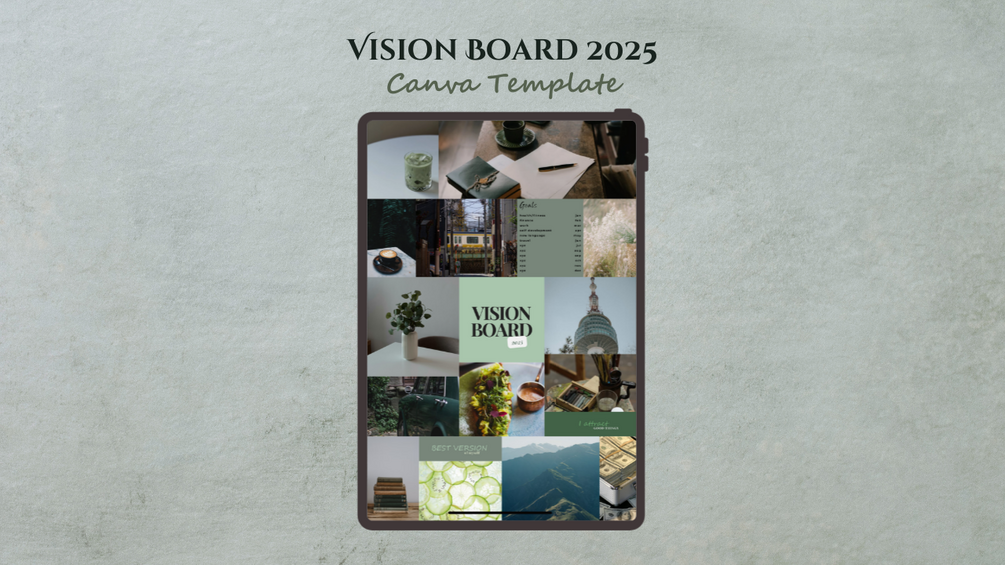 Bring your 2025 goals to life with this minimal, aesthetic Vision Board Canva Template. Curated with a calming green theme, this template is designed to keep you inspired and focused. Perfect for anyone ready to level up their year with a clear, visually stunning plan for success.